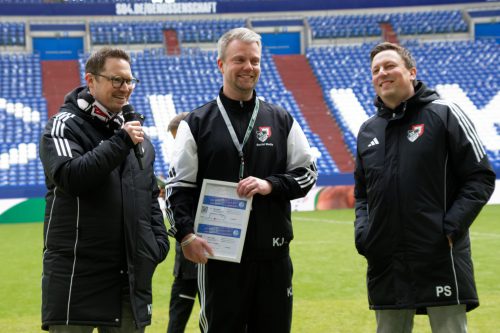 Als schließlich alle ihren Platz in den zahlreichen Bussen gefunden hatten, brachte ein weiterer Moment die Menge zum Jubeln: Der Schalke-Mannschaftsbus fuhr vor, um unsere Erste Mannschaft abzuholen und sie zu ihrem Heimspiel in die Arena nach Gelsenkirchen zu bringen. Spätestens da wurde jedem klar, dass dieser Tag etwas Einzigartiges werden würde.