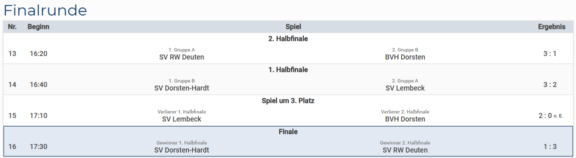 Nachdem sich der SV Lembeck im Halbfinale in einem spannenden Spiel dem SV Dorsten-Hardt knapp mit 3:2 geschlagen geben musste, zeigte die Mannschaft im Spiel um Platz 3 noch einmal große Moral und Einsatzbereitschaft und konnte sich letztlich den dritten Platz sichern.