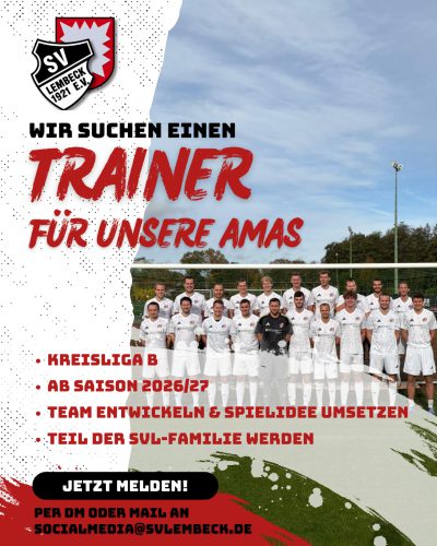 Du hast eine klare Spielidee, bist ein absoluter Teamplayer und hast Bock, unsere Jungs weiterzuentwickeln? Dann bist du beim SV Lembeck genau richtig!